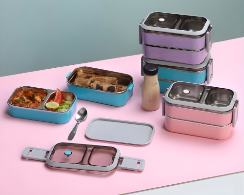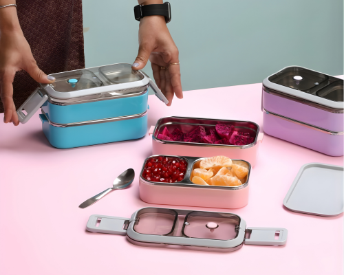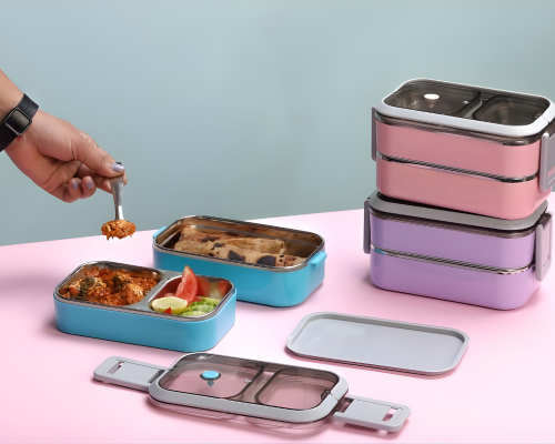 Strong stainless steel lunch box with three compartments and secure lock keeps food fresh, safe, and neatly separated.