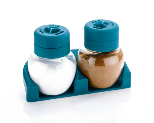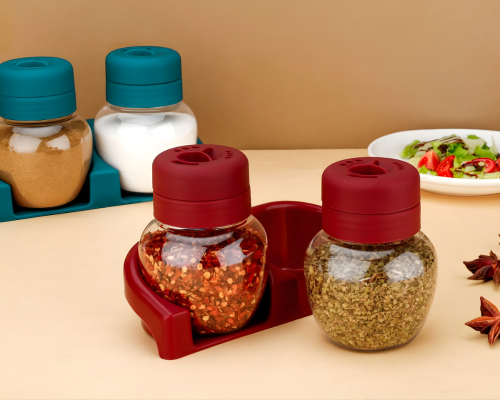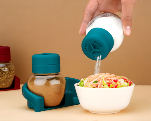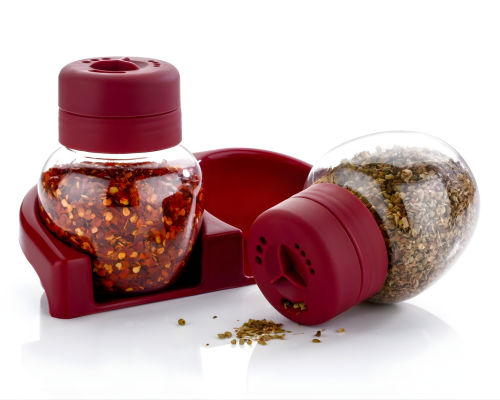 Conveniently store and dispense spices with the Dual Spice Dispenser, featuring airtight lids, clear containers, easy pouring, and a compact design.