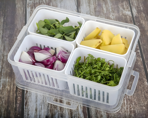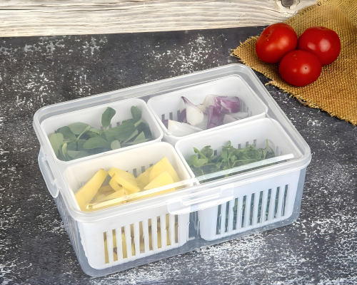 Fridge container with 4 grid cups and lock keeps food separated, fresh, spill-free, and organized inside your refrigerator.