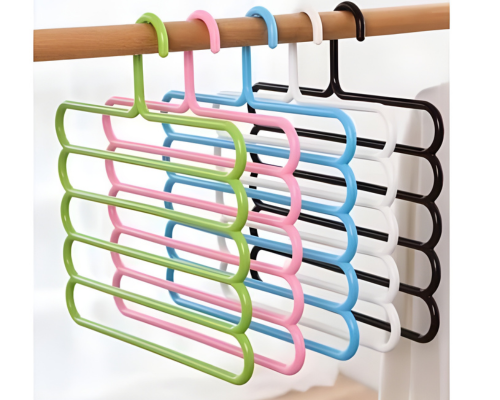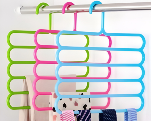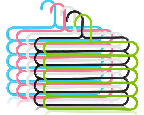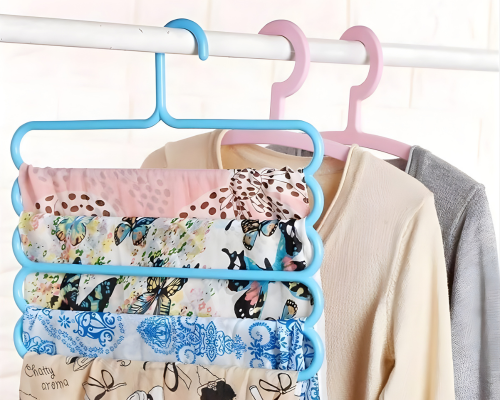 Space-saving plastic 5-layer hanger to organize clothes efficiently, perfect for closets, wardrobes, and maximizing storage space.