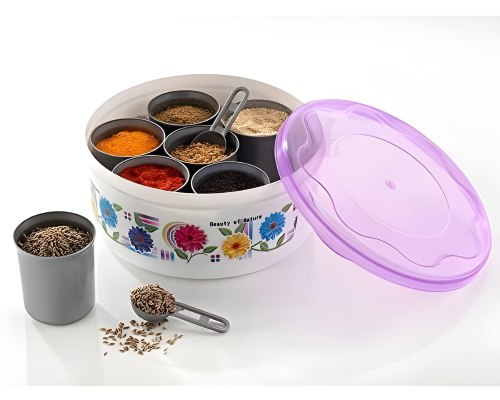 Round Multipurpose Masala Box 2T features dual-tier design with airtight compartments to keep spices fresh and organized efficiently.