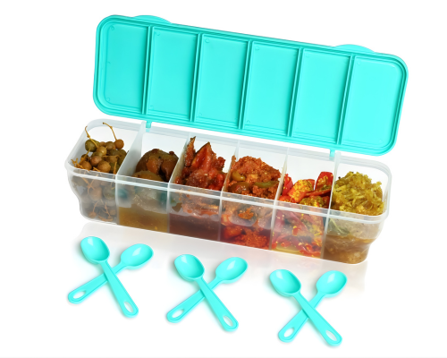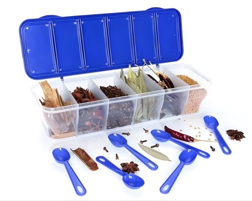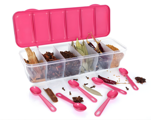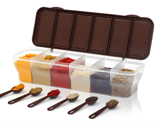 Organize your spices smartly with this 6 in 1 masala box, featuring spoons for easy cooking access.